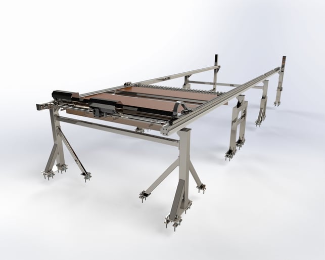 Sondermaschinenbau ist unsere Leidenschaft. Wir setzen Sondermaschinen komplett um. Wie z.B. dieses Gittermaschen Förderband auf einer 12m langen Linearachse fahrend, komplett in Chromstahl.